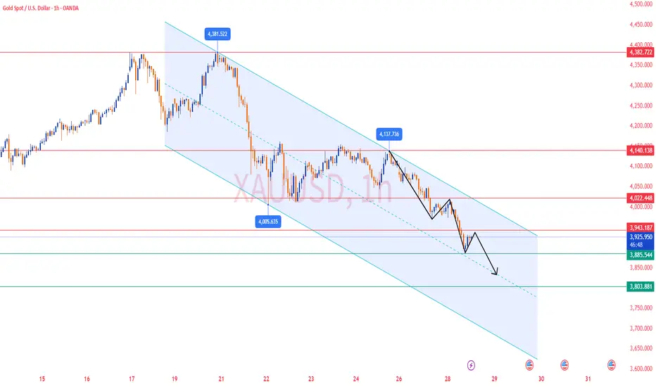 Gold is currently trading around 3900, still within a downward trend channel.