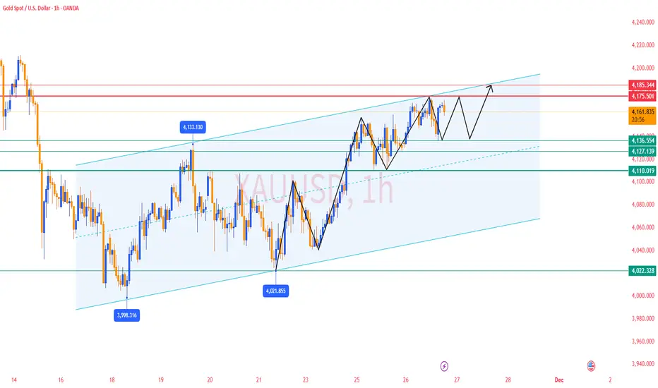 The 1-hour chart shows a weak upward attempt followed by consolidation, and price action above 4170 shows a lack of willingness from buyers to chase higher levels—short-term momentum remains weak.