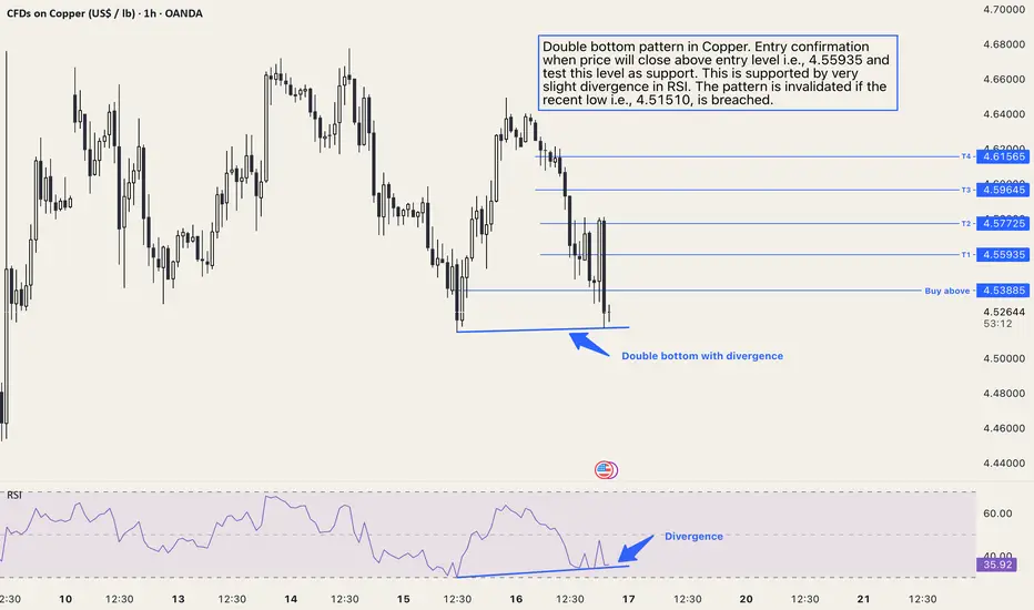 Double bottom pattern in Copper. Entry confirmation when price will close above entry level, i.e., 4.55935 and test this level as support. This is supported by a very slight divergence in RSI. The pattern is invalidated if the recent low, i.e., 4.51510, is breached.