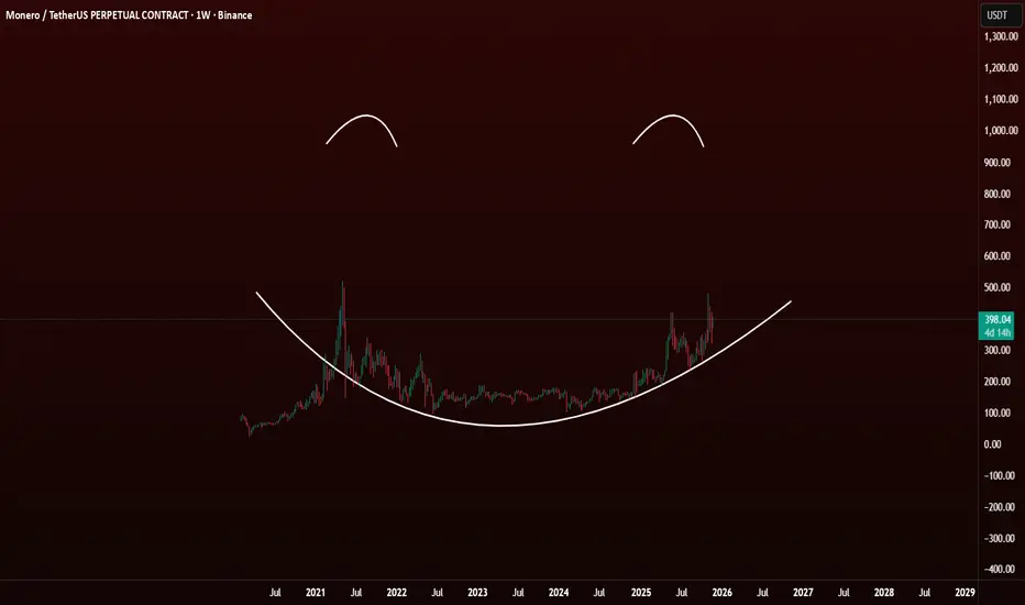 XMRUSDT.P Current market price sits at 398, well above the accumulation base and curving upward with strength. The rounded structure suggests steady buyer absorption, setting the stage for a bullish continuation. With the all‑time high at 521, the curve formation points to momentum building for a retest and potential breakout beyond that level.