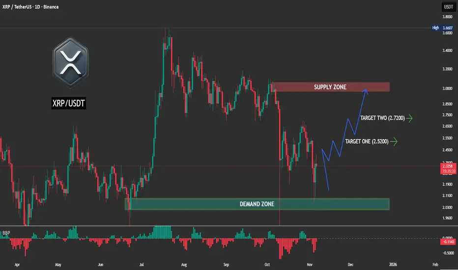 The chart shows XRP bouncing from a strong demand zone, signaling a potential short-term reversal after recent selling pressure. The price action suggests that buyers are gradually regaining control, with momentum shifting upward toward key resistance levels.