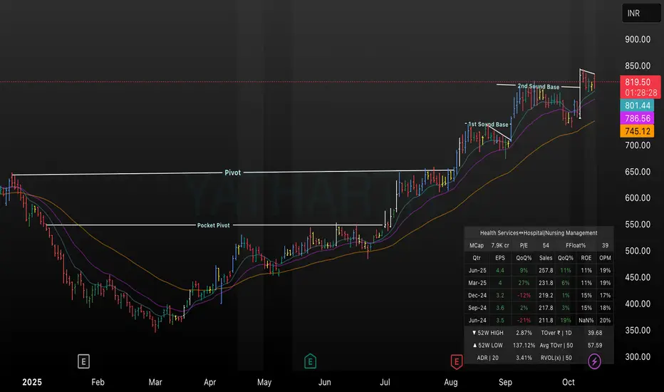 This TradingView chart of YATHARTH (2025) highlights pocket pivot and main pivot breakouts, followed by the formation of 1st and 2nd sound bases as part of an uptrend transition. The chart visually marks pivot points and key support zones, tracks steady price movement above rising short and medium EMAs, and displays fundamental statistics for in-depth analysis. Ideal for illustrating how pocket pivots can signal early entry ahead of larger base breakouts in a strong trend, this chart serves as an educational example for advanced technical traders.