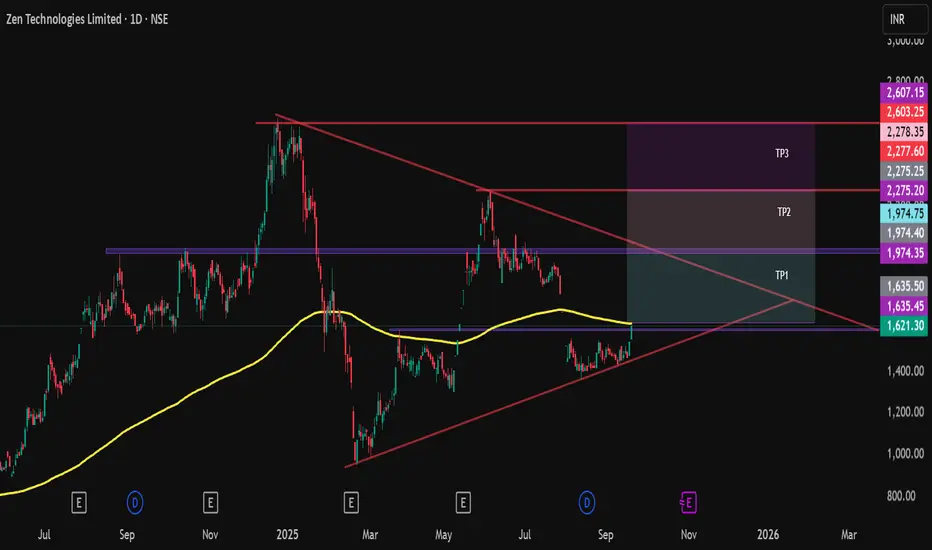 Zen Technologies (NSE: ZENTECH) is testing a key breakout at the ₹1,630–1,635 zone (200-day MA + horizontal resistance). A daily close above this area with strong volume could trigger targets at ₹1,950 and ₹2,275+. Support lies at ₹1,555 and trendline near ₹1,450.