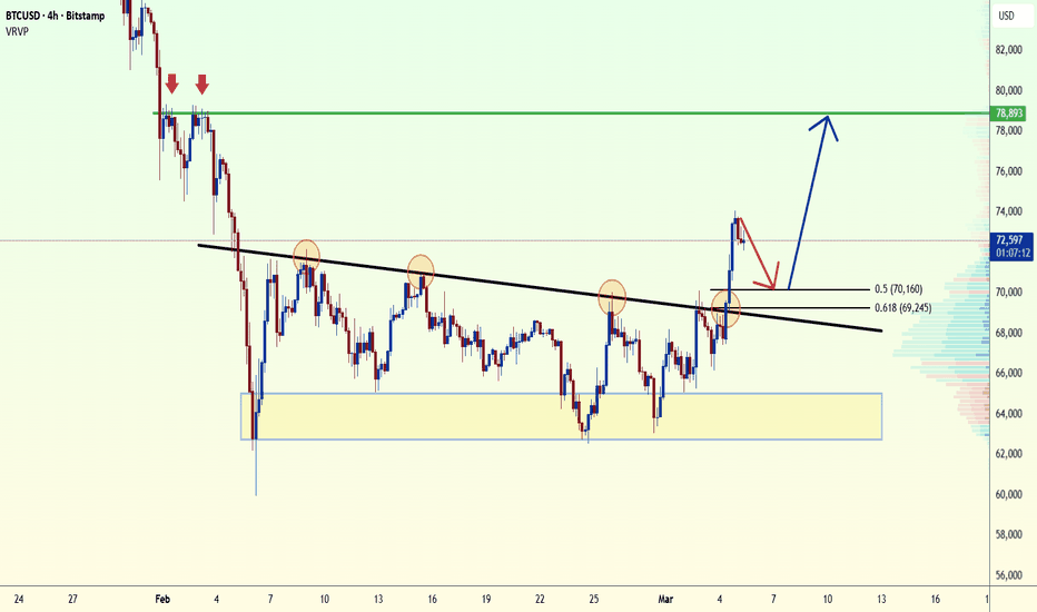 From a technical standpoint, BTC has just broken the descending trendline and the price channel that had been restricting movement for several weeks. The market is now testing the 0.5 – 0.618 Fibonacci retracement zone, which represents a critical decision area. If price manages to hold above this zone, it could confirm a continuation of the bullish move and open the path toward the next liquidity level around 78,000.