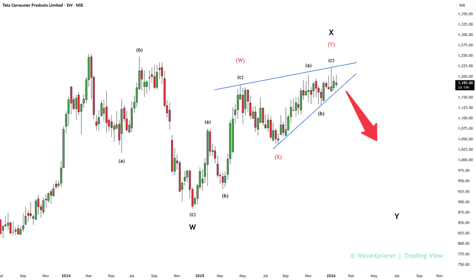 Tata Consumer Products Ltd – Rising Wedge: Trap or Topping?Price is grinding higher inside a rising wedge , marked by converging trendlines and overlapping structure. This is not impulsive behavior — it fits better as a corrective Wave X , typically seen before the next leg of decline.