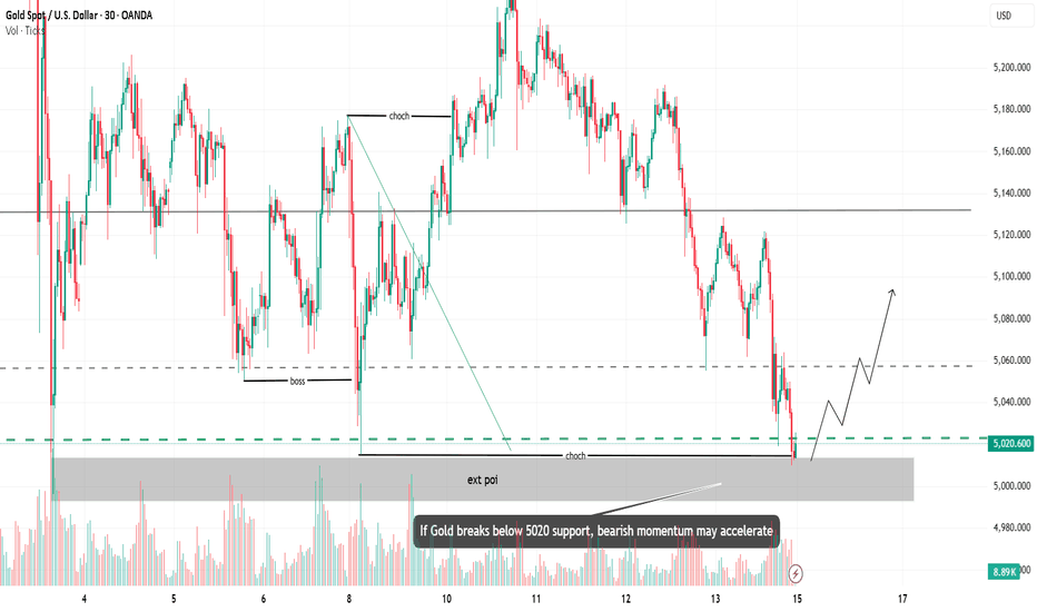 For now, 5020 remains the key trigger level. A clean break below this support could open the path for a move toward 5000 → 4985 → 4960, making this area one of the most important zones to watch for the next directional move in gold.
