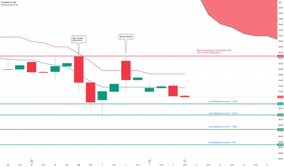 On the 4H chart, ITC attempted a Kijun reclaim but failed to gain acceptance. The probe above equilibrium was sold into, followed by compression and a delayed but decisive close back below Kijun. Weekly price action remains under the Kumo , keeping HTF bias firmly bearish.