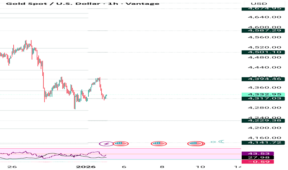 - 4405 and 4445 are strong confluence resistance zones, aligning with the 50% and 61.8% Fibonacci retracement of the prior decline.