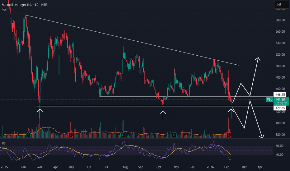 Varun Beverages Ltd. VBL daily chart with the drawn annotations can be analysed from both positive (bullish) and negative (bearish) perspectives:
