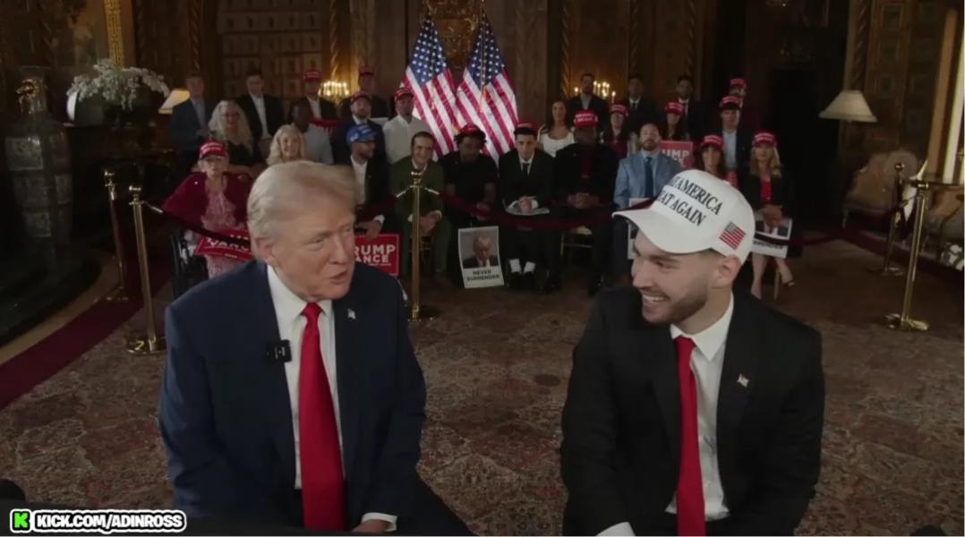 2024 年 8 月,Mar-a-Lago 的客厅,特朗普与 Adin Ross 面对面坐着。Ross 25 岁,是美国最有影响力的年轻主播之一,观众多为男性 Z 世代。