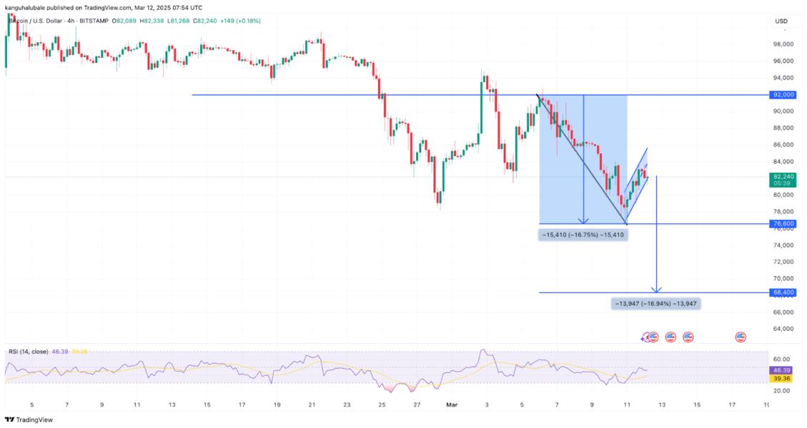 - 看跌旗形在比特币从9.2万美元跌至3月6日至11日的局部低点7.66万美元之后形成。