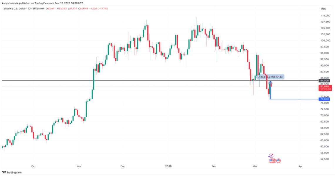 3月12日的亚洲早盘时段,比特币触及8.37万美元的高位,而在前一天3月11日,比特币曾短暂跌至7.66万美元的低点,市场情绪稍有改善。然而,比特币价格在8.4万美元的关键阻力位遇阻,引发市场对于比特币价格是否会进一步下跌的广泛讨论。