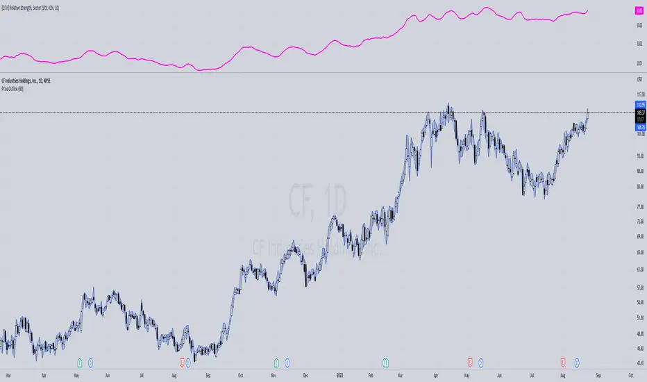 Displays the Relative Strength (RS) of a symbol in relation to some common sector ETFs, SPX and NDX (select from drop-down list). This is done by dividing the symbol's price by the chosen sector ETF's price.