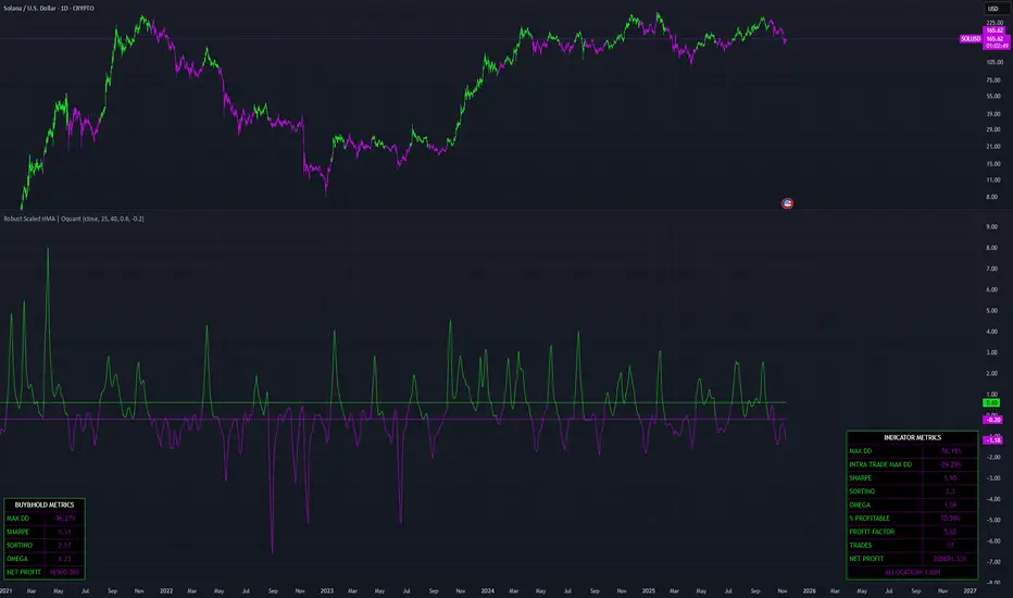 The Robust Scaled HMA indicator is a trend-following tool, leveraging a Hull Moving Average (HMA) with robust statistical scaling to generate buy and sell signals. It helps traders identify potential entry and exit points for long and short positions while providing comprehensive performance metrics to evaluate the strategy's effectiveness compared to a simple buy-and-hold approach(remember past performance doesn’t guarantee future results). By incorporating outlier-resistant scaling, it aims to deliver smoother, more adaptive signals in volatile markets. The indicator also visualizes allocation signals, equity curves, and key metrics in intuitive tables, empowering users to make data-driven decisions without relying on overly complex optimizations.