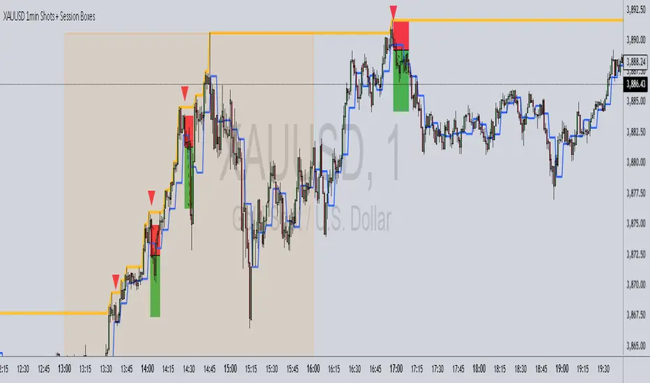 This script is for use on the 1min timeframe, we are looking for quick scalp trades when price reverses from Highs or lows - when the shot fires taking a 1:2 Trade 500pips TP and 250pips SL