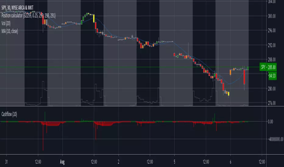 Updated this version to better display current cashflow status. Cashflow simply is change in close price times volume. I believe this tells me current interest in that changing price, supply and demand. Since most of trading today is automated, this indicator displays on/off notifications of the computers current trend. The way I see the indicator is each red large candle is a sword stabbing a large cash filled balloon. Each stab of the bears sword leaves pools of blood from the lambs. More blood means sinking balloon. The candles are colored based on comparisons to current cashflow and average cashflow. User has control over desired moving average length. I recommend logical moving averages. 12 weeks or 1 quarter makes sense. 6-8 hours for an hourly would also make sense. I have spent dozens of hours perfecting the moving averages. What I have found each chart is different. I recommend adjusting the cashflow moving average until the buys and sells make sense. This baby is not perfect, keep your stops tight and AVOID consolidation days. I am making this public because I want everyone to make more money. Give it a like if this indicator is profitable. Suggestions welcome.