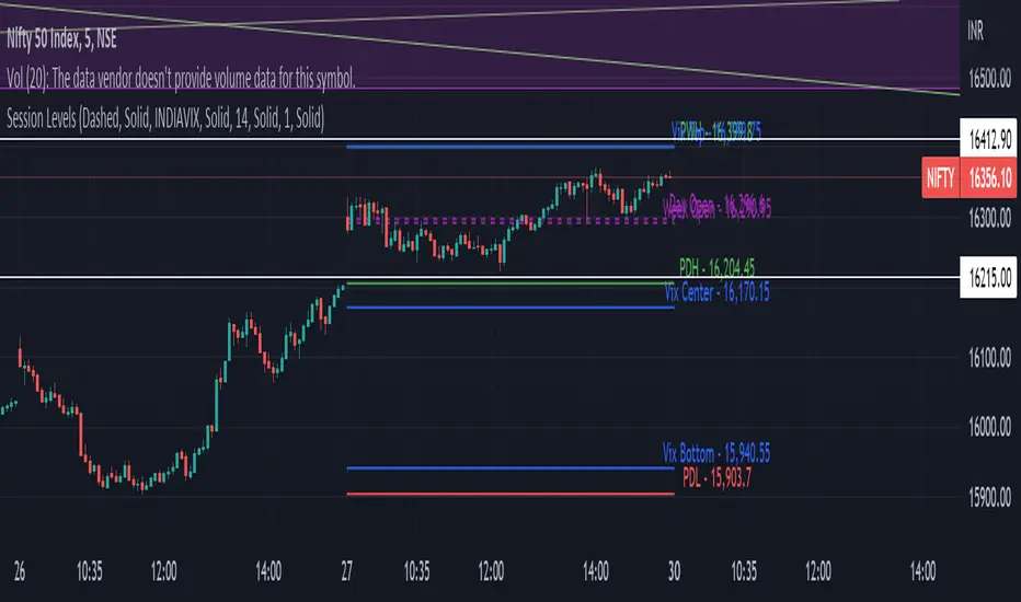 This indicator plots important session (intraday) levels for the day. It plots high and low of previous day, week, month, 52 week and all time. Also plots the vix range which shows the daily expected trading range of the instrument. These levels acts as important support/resistance for the day.