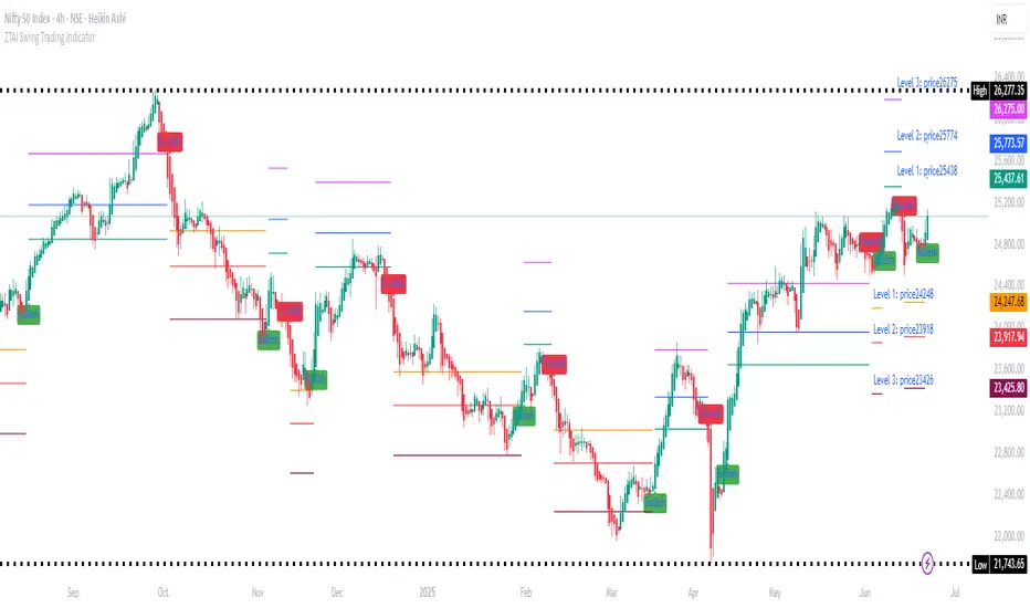 ZTAI Swing Trading Indicator is a unified Pine-Script v6 study that teaches you to spot swing highs and lows across Stocks, Futures, Options & Commodities—without writing a line of code. By blending price-action (EMA, VWAP & daily pivots), momentum (RSI & MACD) and Volume-Smoothed PPO reversals, it highlights three clear swing levels per session so you can build disciplined, level-based analysis with total peace of mind. Here is a video on how it works.