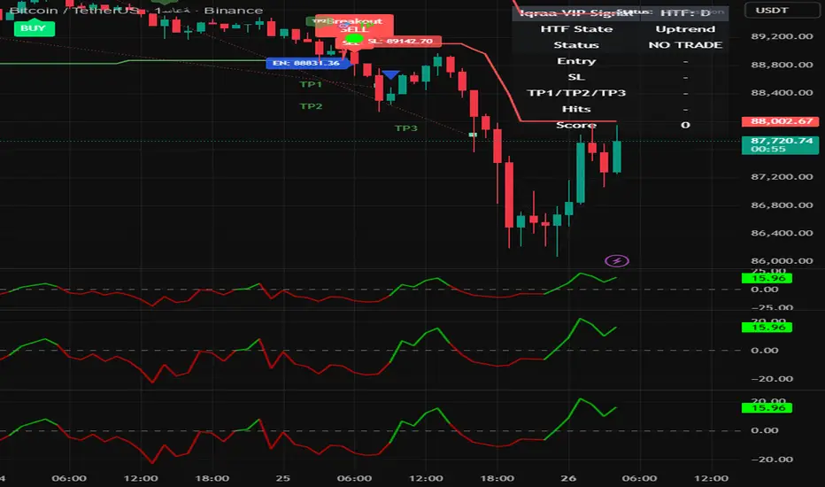 **Iqraa VIP Signal** is a professional indicator that works on **all symbols and all timeframes** (Crypto / Forex / Stocks). It uses a **multi-confirmation confluence engine** to generate cleaner, stronger entries with clear trade management.