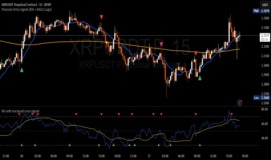 This script provides precise entry signals based on a clean confluence of MA12 breakouts and RSI momentum, filtered by a VWMA (Volume-Weighted Moving Average) of the RSI.