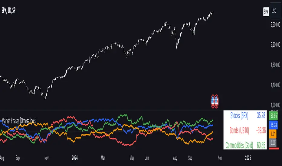 The Market Phases indicator utilizes the Detrended Price Oscillator (DPO) to assess various asset classes, bonds, or stock sectors across different market phases. It offers users the ability to monitor and compare trends in multiple markets through a normalized DPO approach, providing insights into relative overbought or oversold conditions. The indicator supports three distinct modes: "Asset Classes," "Bonds," and "Stock Sectors," allowing flexibility in market analysis based on user preference.