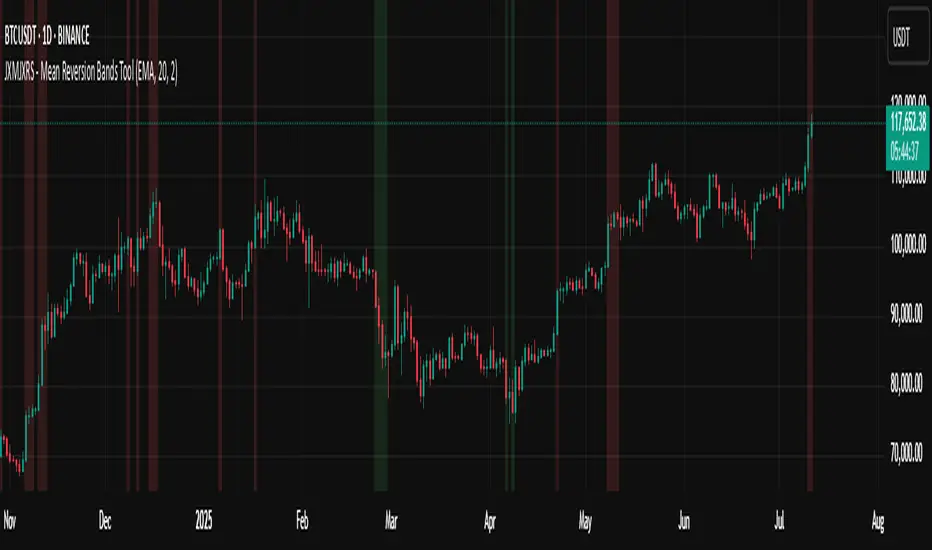 This indicator highlights when price is likely overextended and may revert back toward its average. It does this by plotting a central mean (EMA, SMA, or VWAP) with dynamic bands based on either standard deviation or ATR. These bands help show how far price has moved from normal levels.