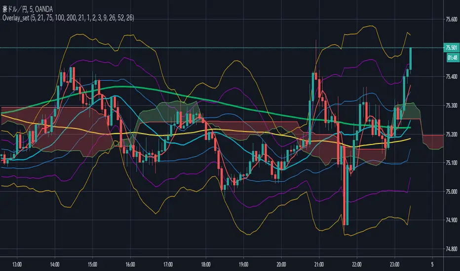 It is a set of overlay indicators that combine 5 simple moving averages, Bollinger band, and clouds of Ichimoku cloud.