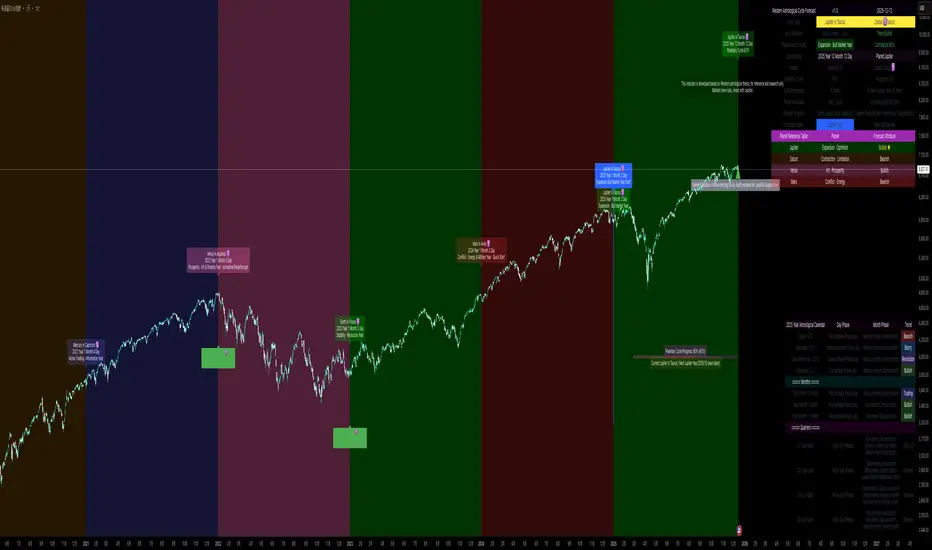 The Western Astrological Cycle Trading Indicator is a comprehensive Pine Script tool that overlays astrological cycles and predictions onto trading charts. It integrates Western astrological theory with technical analysis to provide unique cyclical perspectives on market movements based on planetary and zodiacal alignments.