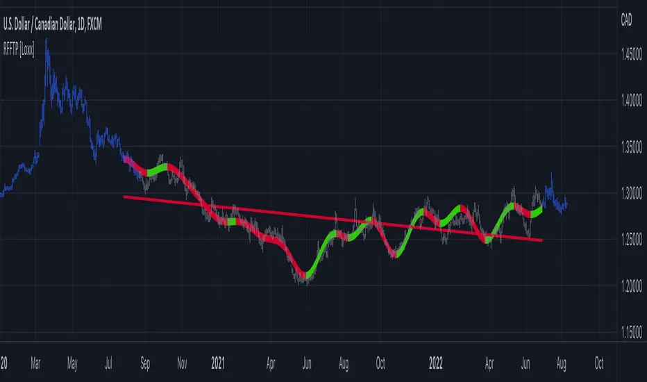 Real-Fast Fourier Transform of Price w/ Linear Regression [Loxx] is a indicator that implements a Real-Fast Fourier Transform on Price and modifies the output by a measure of Linear Regression. The solid line is the Linear Regression Trend of the windowed data, The green/red line is the Real FFT of price.
