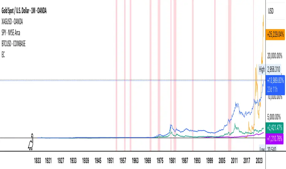 By overlaying this indicator on your Gold, Silver, SPY, and Bitcoin chart (for example), you can quickly spot historical market reactions and use that insight to predict possible behaviors in future downturns.