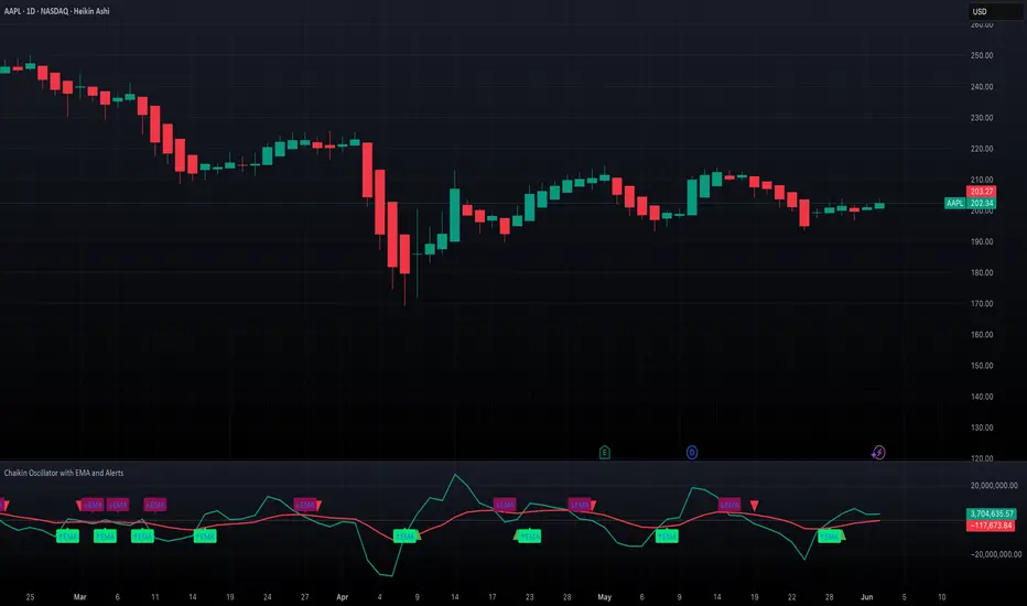 This indicator plots the classic Chaikin Oscillator along with an EMA overlay to help identify changes in accumulation or distribution momentum. It includes visual markers and built-in alerts for key crossover events such as crossing the zero line and crossing above or below the Chaikin EMA.