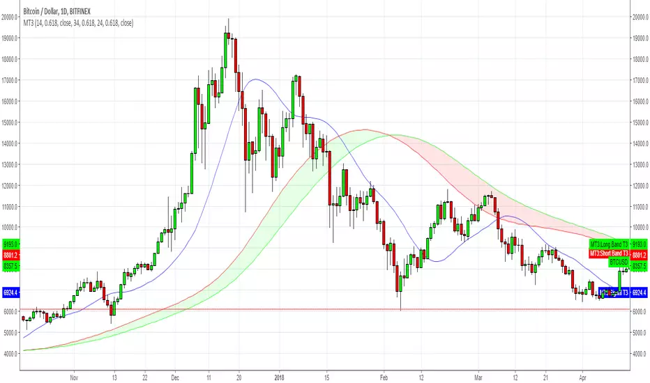 - The bands are working as supports and resistances. When price is above the green band and drops, there is a high chance it will bounce back as soon as it hits the Long Band T3. (It will act as support)