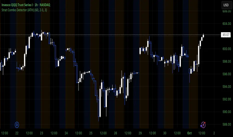 The Strat Combo Detector detects user-defined strat combos (inside/directional/outside bars) on a chosen higher timeframe and optionally marks examples for research.