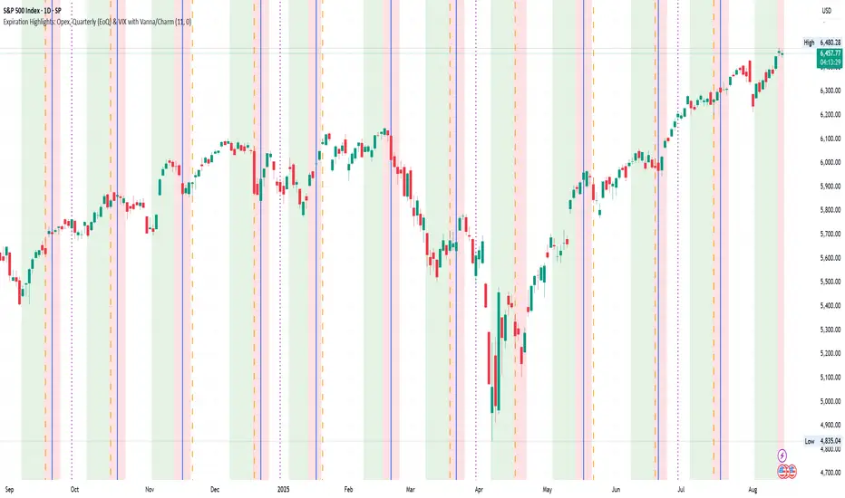 Provides a single, adjustable visualization combining opex, VIX expiration, and configurable vanna/charm/weakness windows into one tool. Fully explained so non-coders can use it without reading the source code.