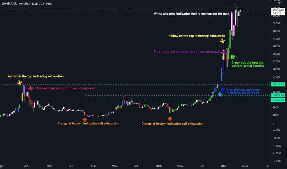This coloring helps to make quick analysis of the moments of greater volatility and movement of the market in a quantitative way, since large volumes foretell great movements.