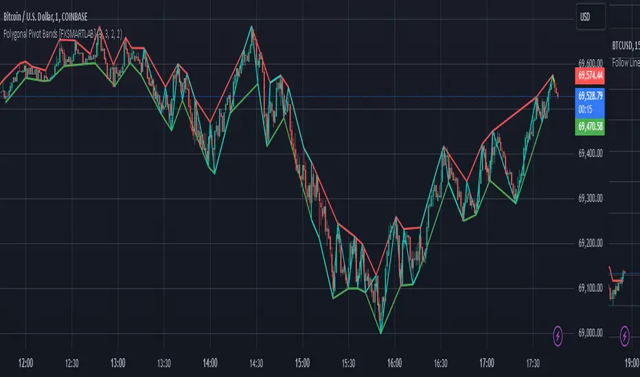 The Polygonal Pivot Bands highlights key price pivots, dynamic support and resistance levels, and recent price action on a trading chart. This indicator connects pivot highs and lows with a zigzag line, extends a real-time dashed line to the latest price point, and plots diagonal support/resistance levels that adapt to price movement. These elements together provide traders with a view of significant price zones and potential trend shifts.