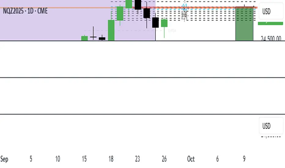 Signal and Targets: It triggers a Long or Short signal when all criteria are met (HTF Bias, FVG, OTE retracement, and Kill Zone timing). It then calculates and plots suggested trade levels, including a Stop Loss (SL) and three Take Profit targets (TP1, TP2, and a dynamic Runner Target based on the weekly Average True Range or ATR).