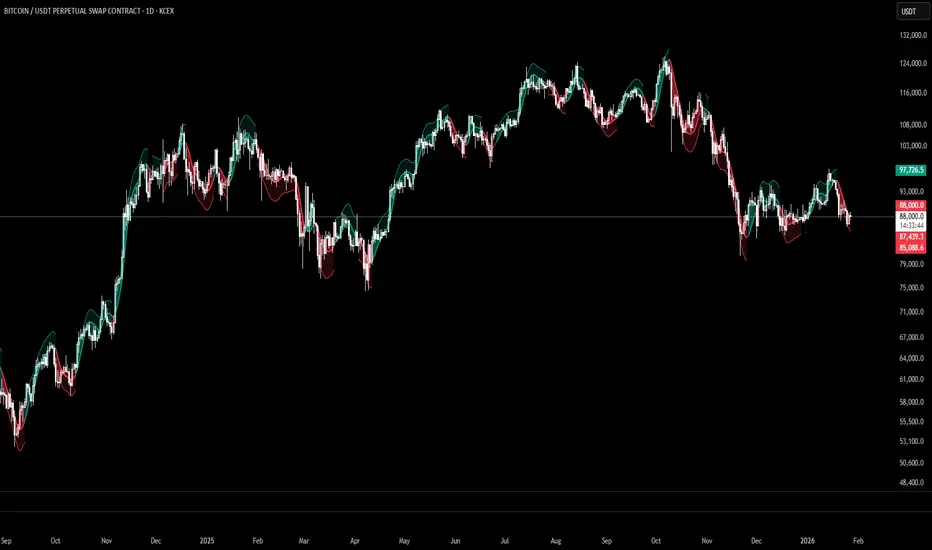 Volatility Extensions: The script plots ATR-based bands (14-period) that only appear during confirmed regimes. In a Bullish regime, the upper band appears, in a Bearish regime, the lower.