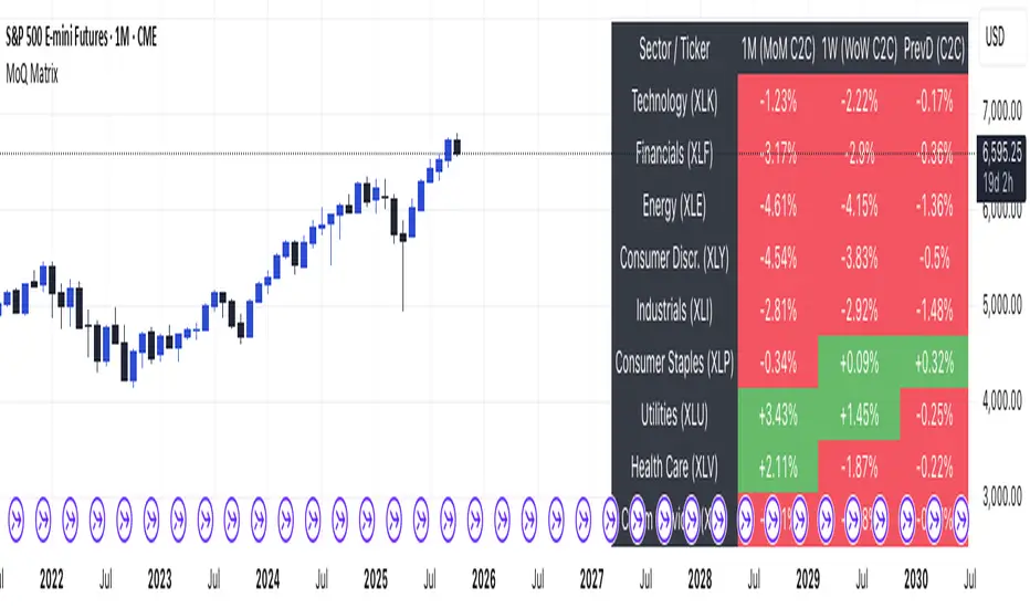The MomentumQ Sector Matrix is a professional dashboard-style indicator designed to help traders quickly evaluate sector performance and momentum alignment across multiple timeframes.