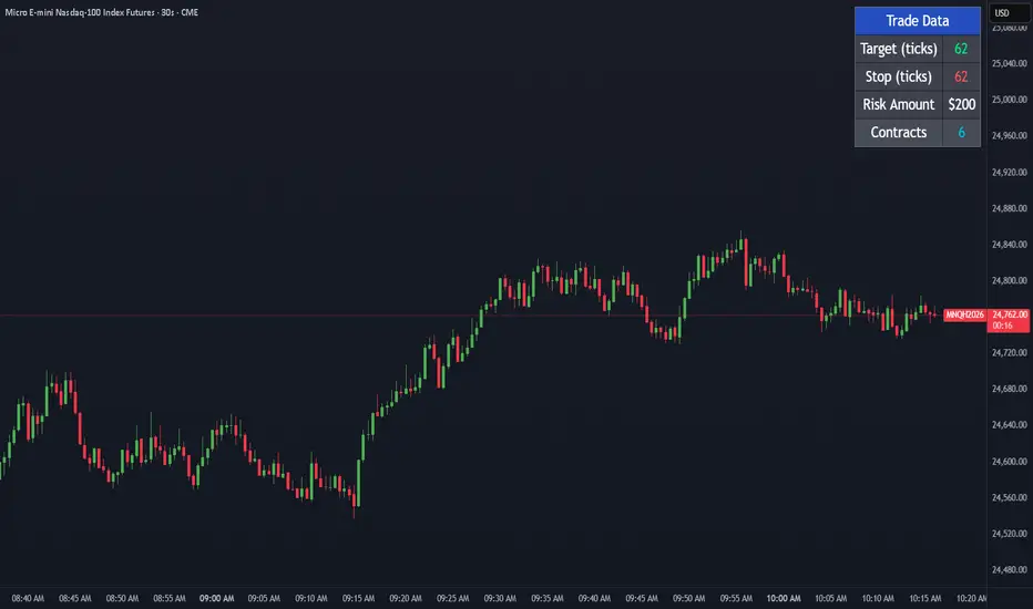This indicator provides real-time position sizing and risk management calculations directly on your chart. It displays a clean data box that helps traders maintain disciplined risk management by automatically calculating the optimal number of contracts to trade based on ATR (Average True Range) volatility measurements.