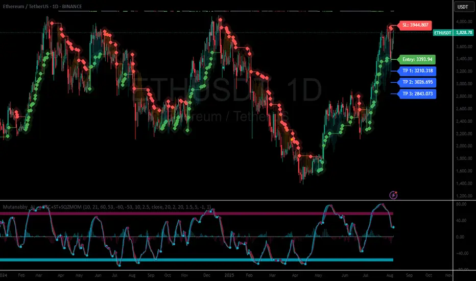 The Mutanabby_AI OSC+ST+SQZMOM indicator combines three proven technical analysis components into a unified trading system, providing comprehensive market analysis through integrated oscillator signals, trend identification, and volatility assessment.