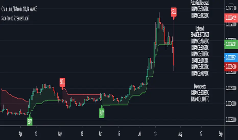 This screens for Supertrend reversal's in 10 different securities. The main logic for the screener is taken from "Simple Custom Screener in Pinescript" by QuantNomad with his permission. If the label color is not visible due to the text in it being white colored, then choose a different color from settings. Also added a simple supertrend to it.