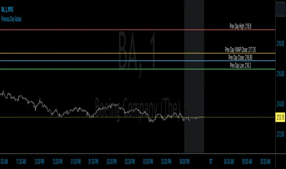 Say hello to the Previous Day Values Indicator, your new best friend in the world of trading. This script, written in the powerful Pine Script version 5, is designed to keep you informed about essential price levels from the previous day's trading session, right on your TradingView chart.