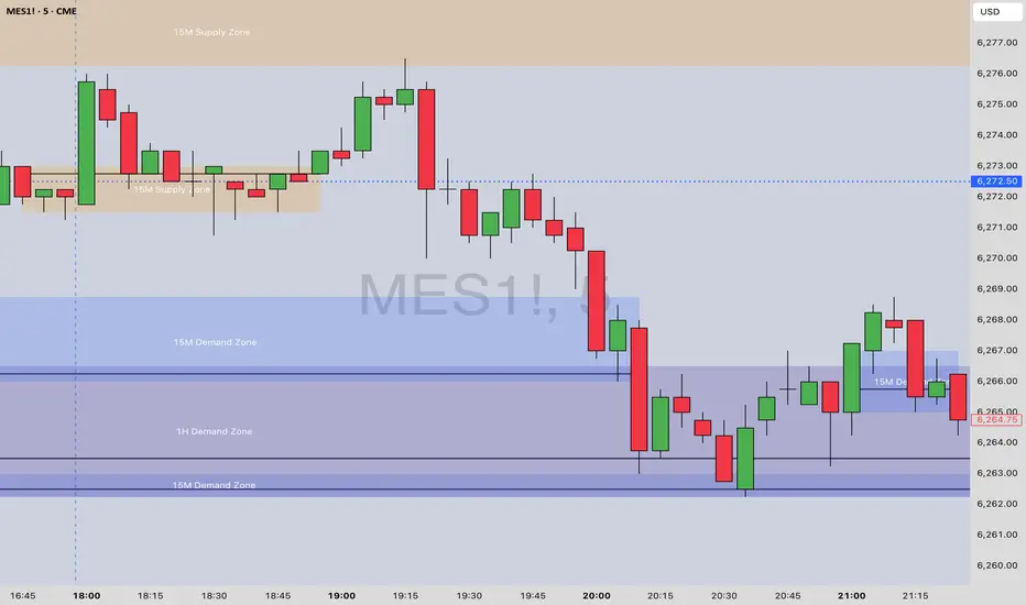 - Automated Zone Labeling: Optional labels at the center of each zone clearly identify the timeframe and type of zone (e.g., “15M Supply Zone”).