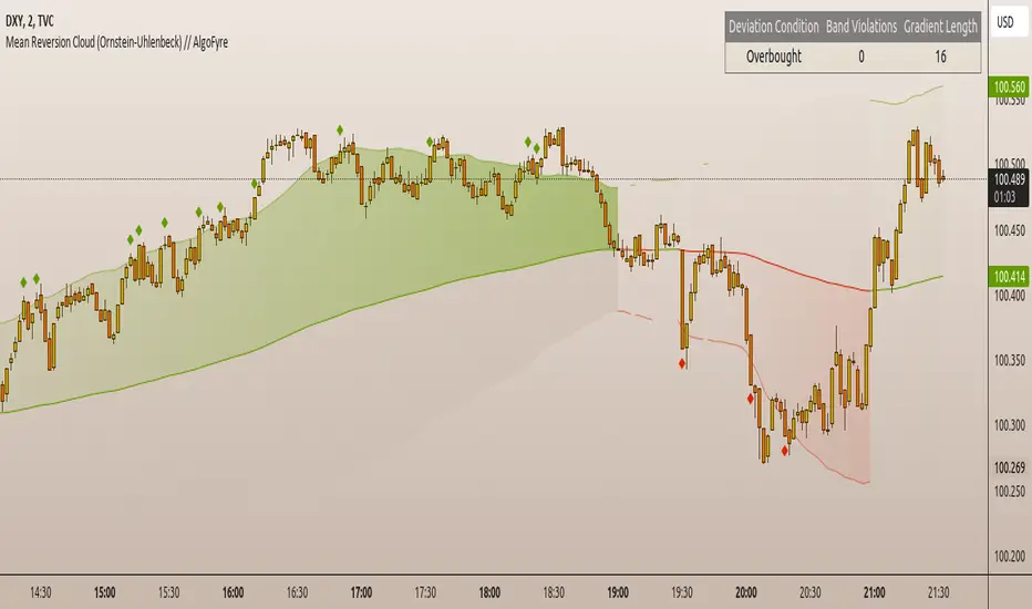 - The Ornstein-Uhlenbeck process describes how a variable, such as an asset's price, tends to revert to a long-term mean while subject to random fluctuations. In this indicator, the EWMA is used to compute the dynamic mean (μ), mimicking the mean-reverting behavior of the OU process.