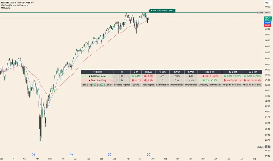 This indicator turns a classic Moving Average Cross into a regime-based trend dashboard. Instead of treating a cross as a standalone “buy/sell” event, it measures what historically happened after similar regime shifts on the current symbol and timeframe, and displays the results in a compact table.