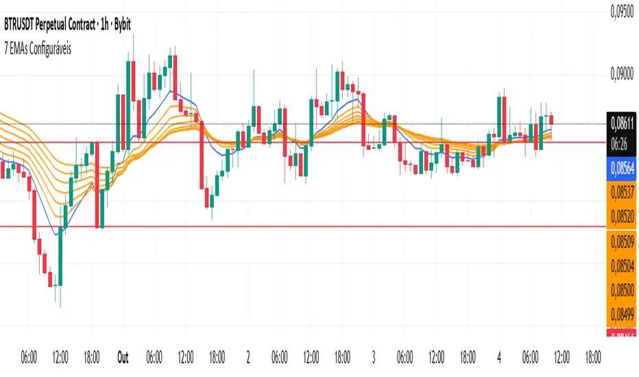 This indicator is designed to provide traders with a comprehensive and flexible view of price trends through the analysis of 7 distinct exponential moving averages (EMAs), each fully configurable. Its main purpose is to help the trader identify short-, medium-, and long-term trends, as well as potential entry and exit points, significant crossovers, and trend alignments.