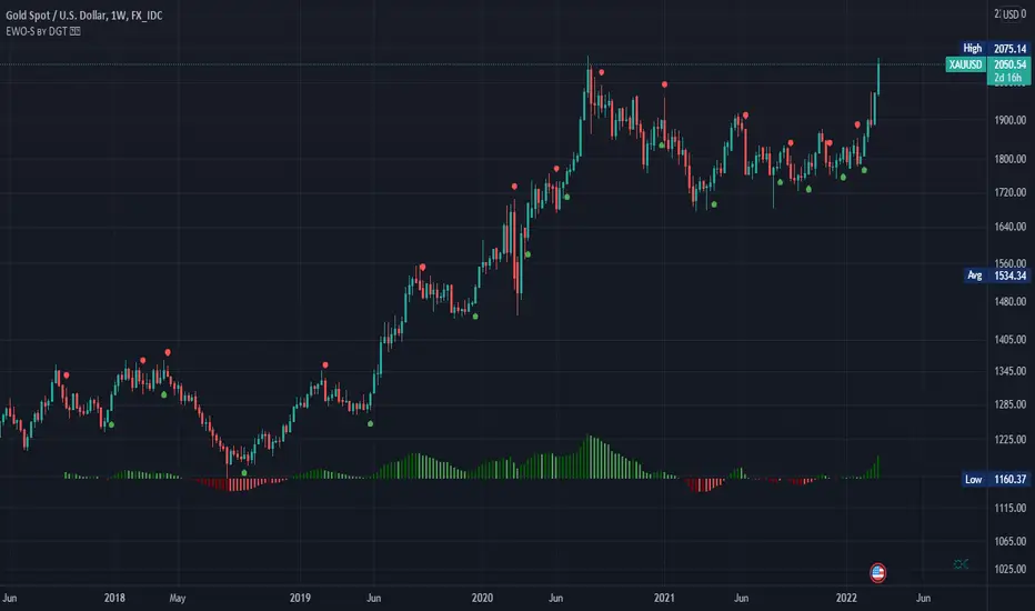 The Elliott Wave Oscillator (EWO) helps identifying where you are in the 5-3 Elliott Waves, mainly the highest/lowest values of the oscillator might indicate a potential bullish/bearish Wave 3. Mathematically expressed, EWO is the difference between a 5-period and 35-period moving average based on the close. In this study instead 35-period, Fibonacci number 34 is implemented for the slow moving average and formula becomes ewo = ema(source, 5) - ema(source, 34)