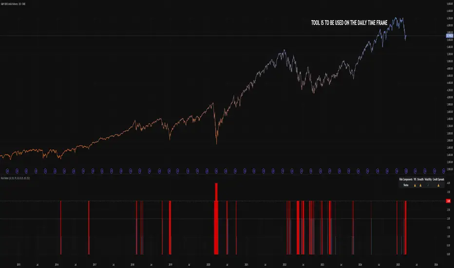 The Risk Meter is a powerful market risk assessment tool designed to help traders evaluate the current risk environment using a simple, data-driven score. By analyzing four critical market factors—VIX (volatility index), market breadth, trailing volatility, and credit spreads—the indicator generates a risk score between 0 and 4. This score empowers traders to make informed decisions about hedging, exiting positions, or re-entering the market, with clear visual cues and alerts for intraday monitoring.
