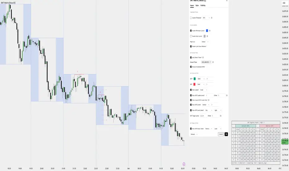 SMT Matrix marks SMT divergences, tags them with a 1–9 digital-root time stamp, draws the end-bar candle zone, and projects stop/target levels. It can auto-select the comparison ticker and show an optional stats table and cycle windows.